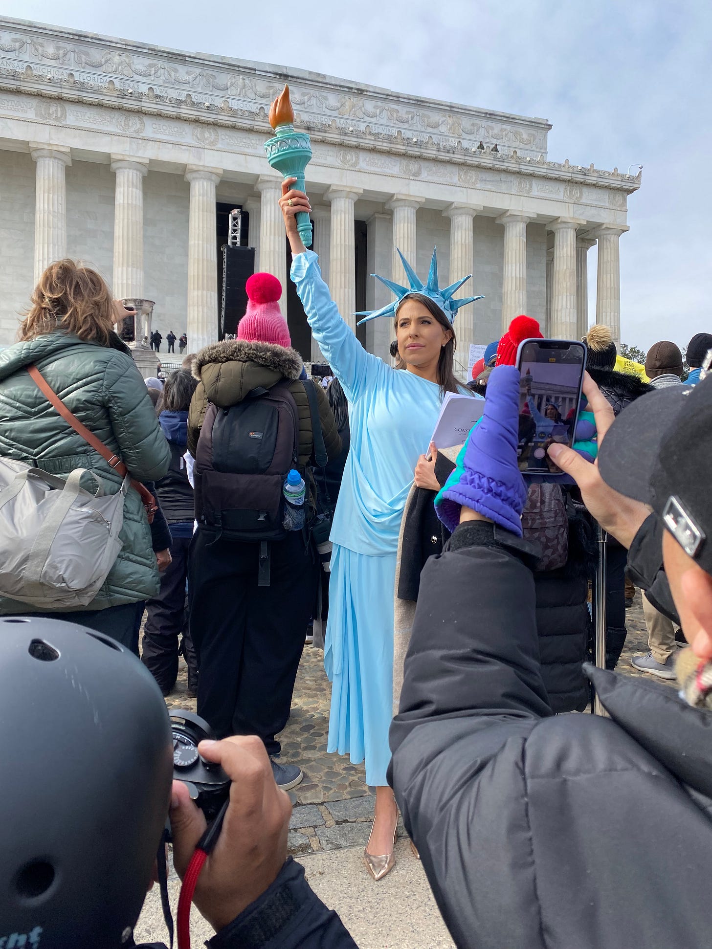 In the crowd, “Don’t Tread On Me Flags” fluttered next to “Coercion is Not Consent” signs. A young woman with long dark hair was dressed all in blue and posing as the Statue of Liberty holding a blue torch and looking boldly to the horizon as videographers and photographers snapped her picture with the Lincoln Memorial in the background. “Let’s Go Brandon” T-shirts and hats were everywhere. In a single glance one could see an American flag flying on a handheld pole with an anti-socialism flag below it—the word “socialism” crossed out with a red line; “Don’t Tread on Florida;” “Government is Waging War Against the People,” and “Liberty Requires JESUS, James 1:25.”