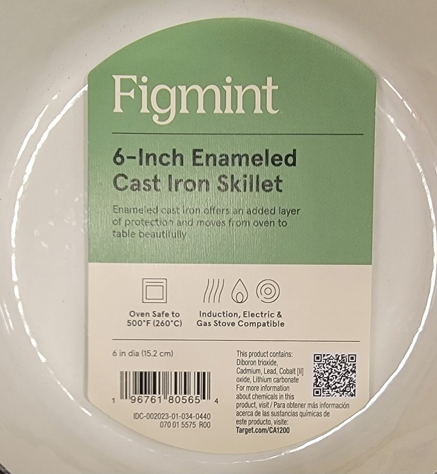 Target, for example, introduced a line of pots, pans, and kitchen gadgets under the name Figmint in 2023. Some pieces, such as the enameled cast iron skillets in the line carry a notice stating they contain a chemical cocktail of lead, cadmium, cobalt, and lithium carbonate. A website listed on the label for “more information” only displays more kitchenware for sale, despite the page being titled “cookware disclosures.”