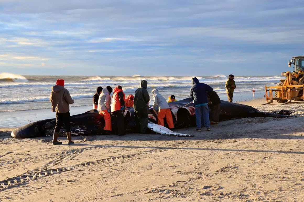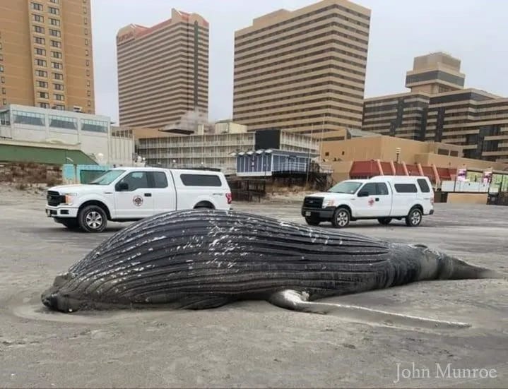 From last December to mid-April, there were forty-one marine mammal strandings along the New Jersey shore alone. That included nine dead humpback whales, a “dependent” female calf sperm whale that washed up alive and died on the beach, a female dolphin who died at the scene and her calf who was euthanized, and eight dolphins that were still alive when they became simultaneously stranded in Sea Isle City. Two died where they landed, and six were subsequently euthanized on the beach.